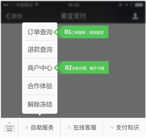 易宝支付(Yeepay007),欢迎手机扫一扫二维码,新增如下功能,关注易宝,使用“微客服”!快捷自助,移动查询!